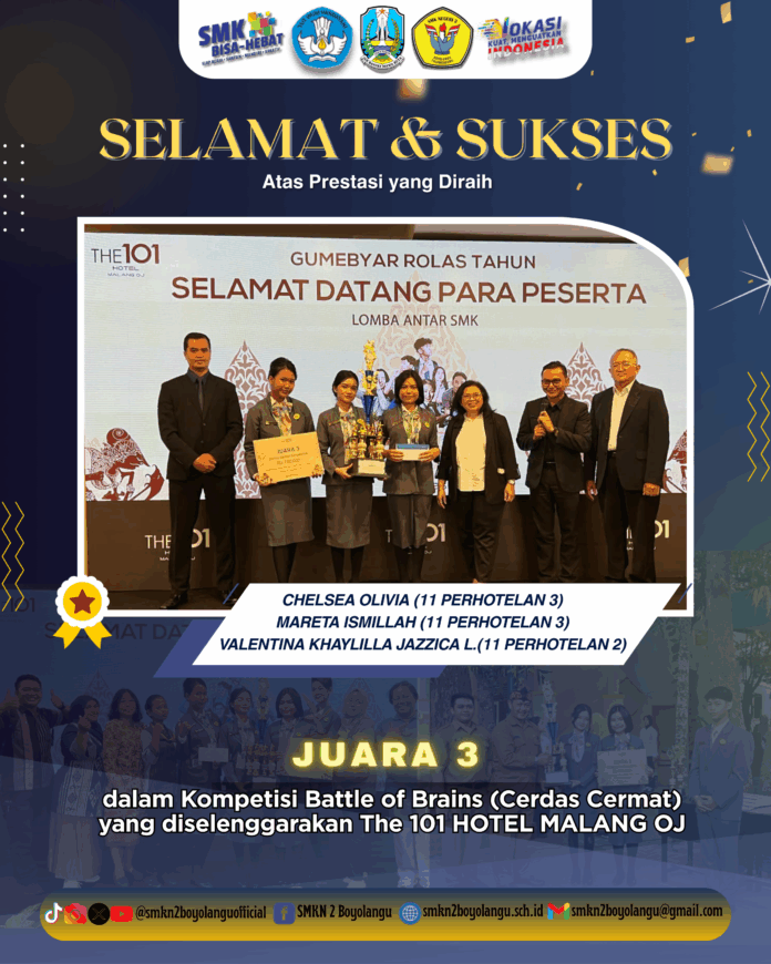SMKN 2 Boyolangu kembali menorehkan prestasi membanggakan! Kali ini datang dari ajang Battle of Brains (Cerdas Cermat) yang diselenggarakan di The 101 Hotel Malang OJ.