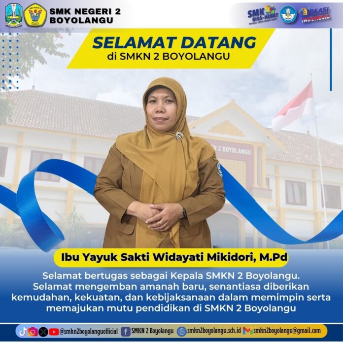 Keluarga besar SMKN 2 Boyolangu mengucapkan selamat datang dan selamat bertugas kepada Ibu Yayuk Sakti Widayati Mikidori, M.Pd sebagai Kepala SMKN 2 Boyolangu.