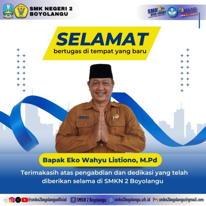 Keluarga besar SMKN 2 Boyolangu menyampaikan terima kasih yang sebesar-besarnya kepada Bapak Eko Wahyu Listiono, M.Pd. atas pengabdian, dedikasi, dan kontribusi luar biasa yang telah diberikan selama bertugas di SMKN 2 Boyolangu.